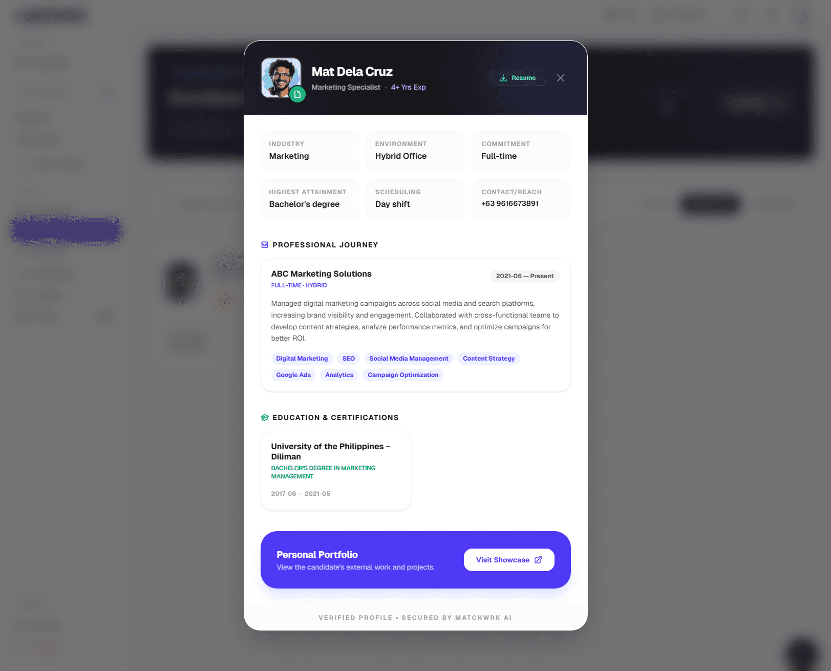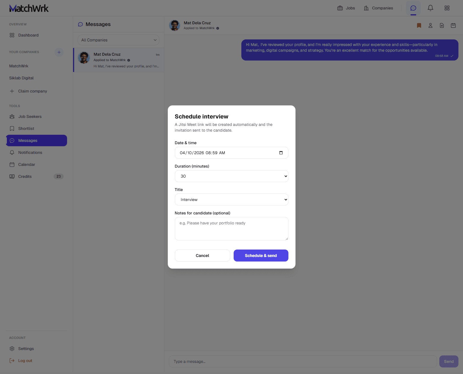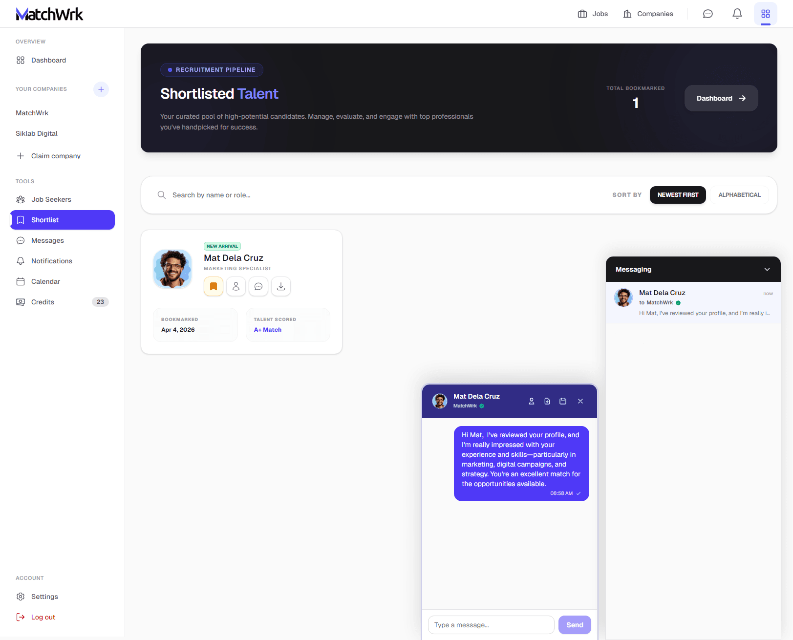 From talent discovery to shortlists, messages, and interviews—one connected flow.