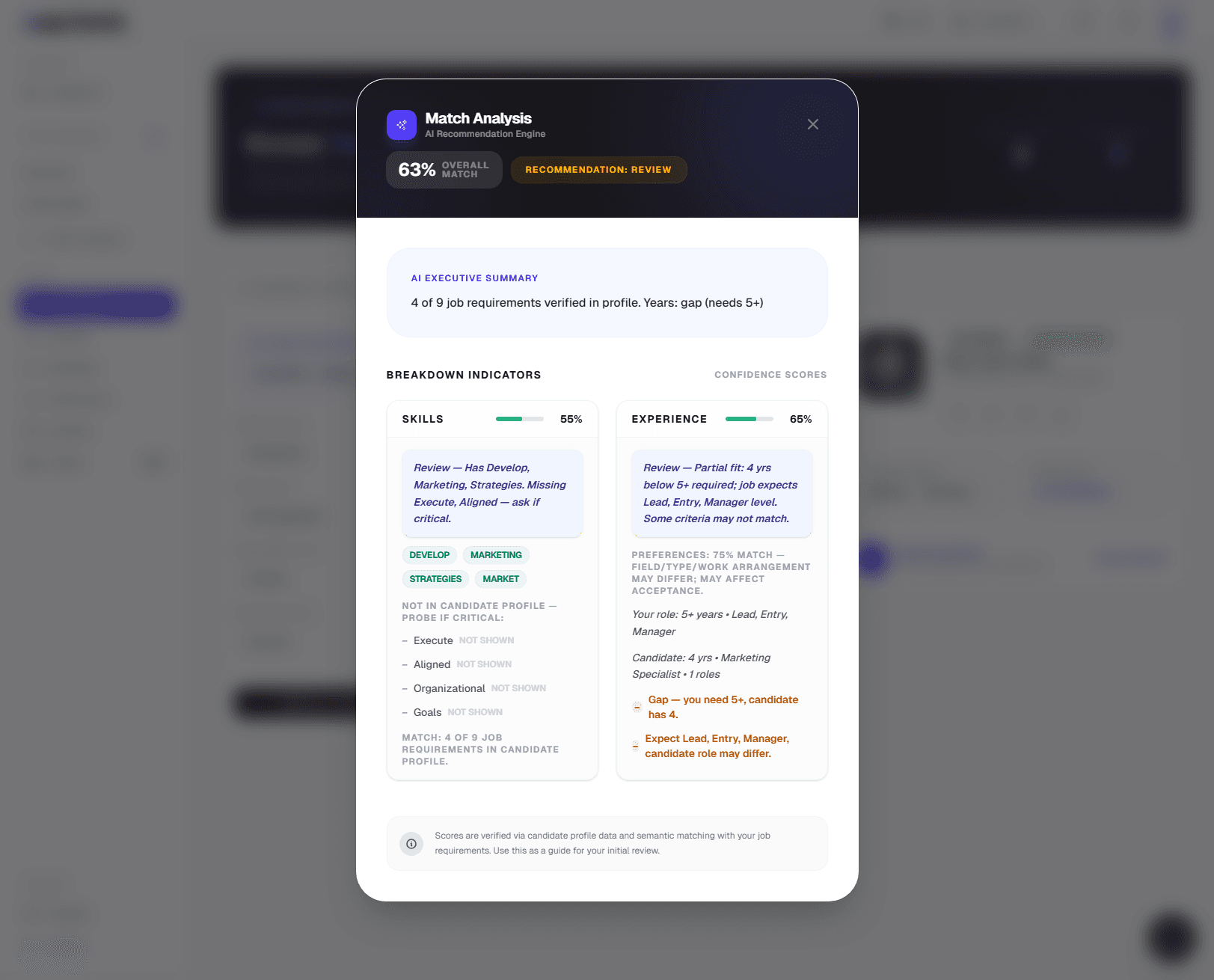 One-sentence summaries: strengths, experience, and fit. Decide who to interview in minutes.