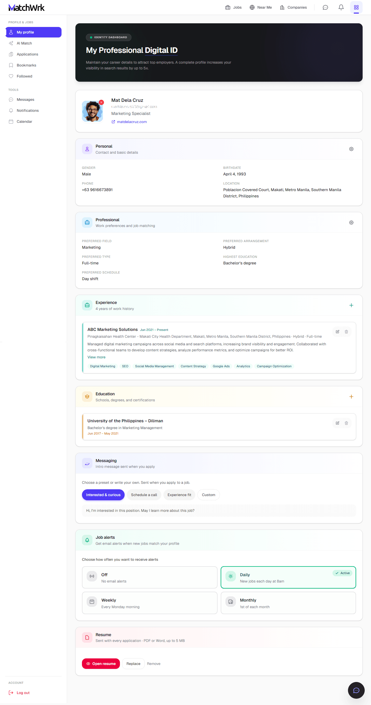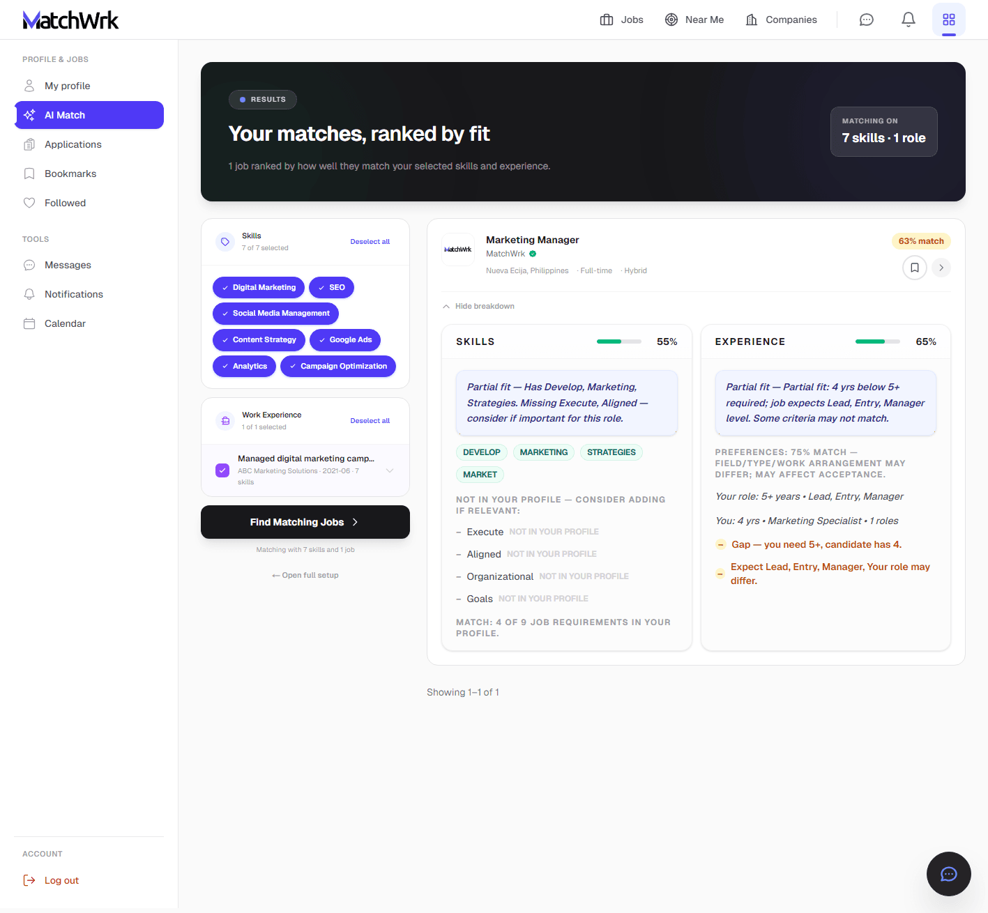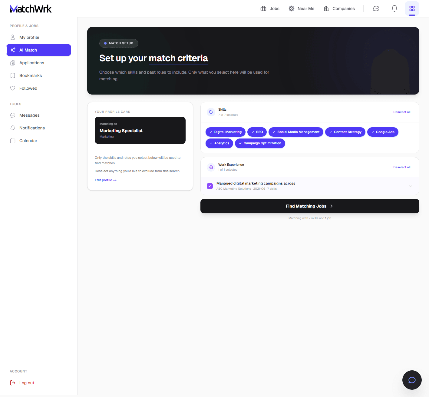 Build your profile, tune how you want to be matched, and scan roles with clarity.